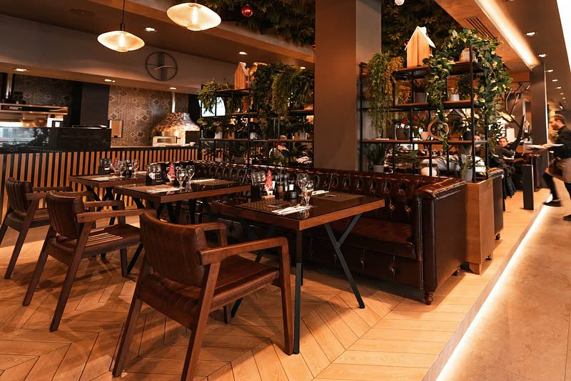 Амбиентот е уреден во модерен, топол стил со комбинација од минимализам, комфор и функционалност. Просторот е погоден за семејства, парови, поголеми групи, како и за деловни гости што бараат мирна и пријатна атмосфера. Ресторанот нуди и Wi-Fi, достава, takeaway опции и професионален персонал кој секогаш стои на услуга.