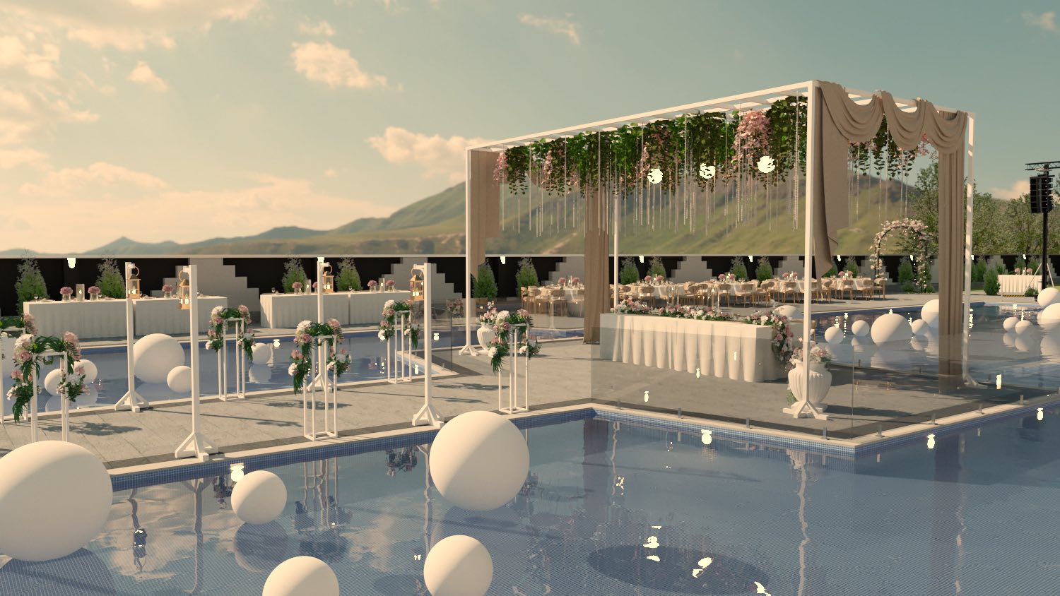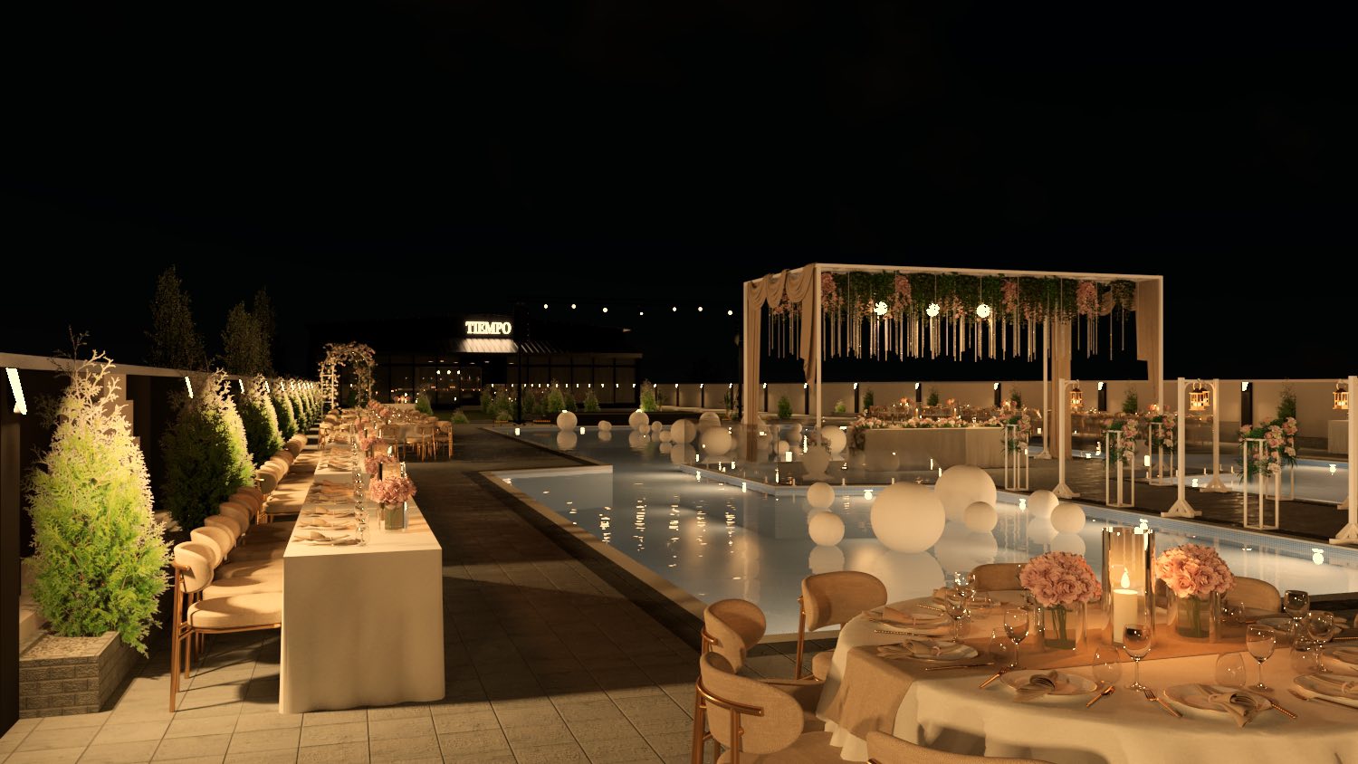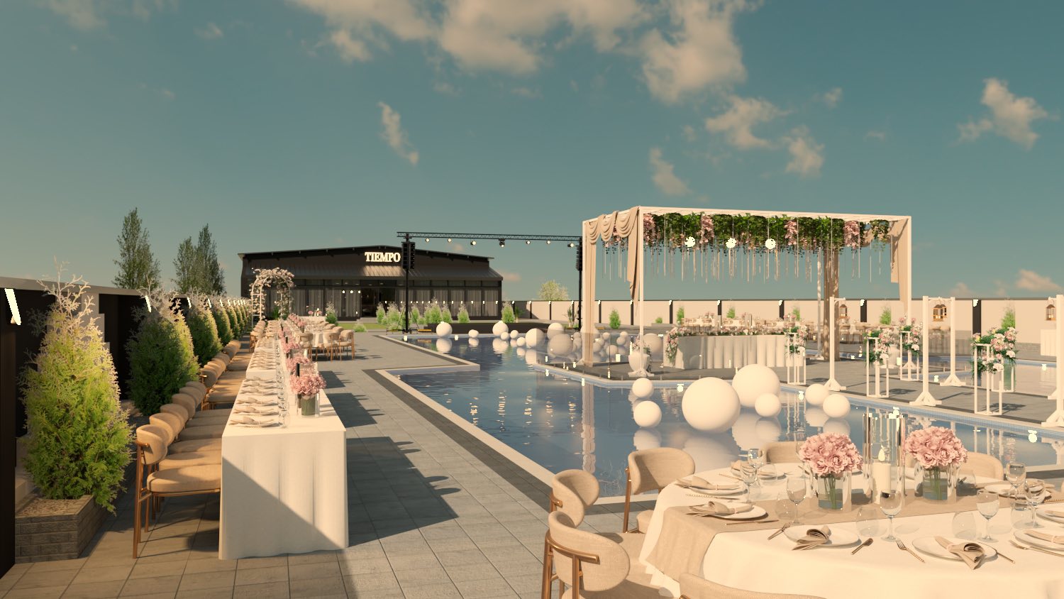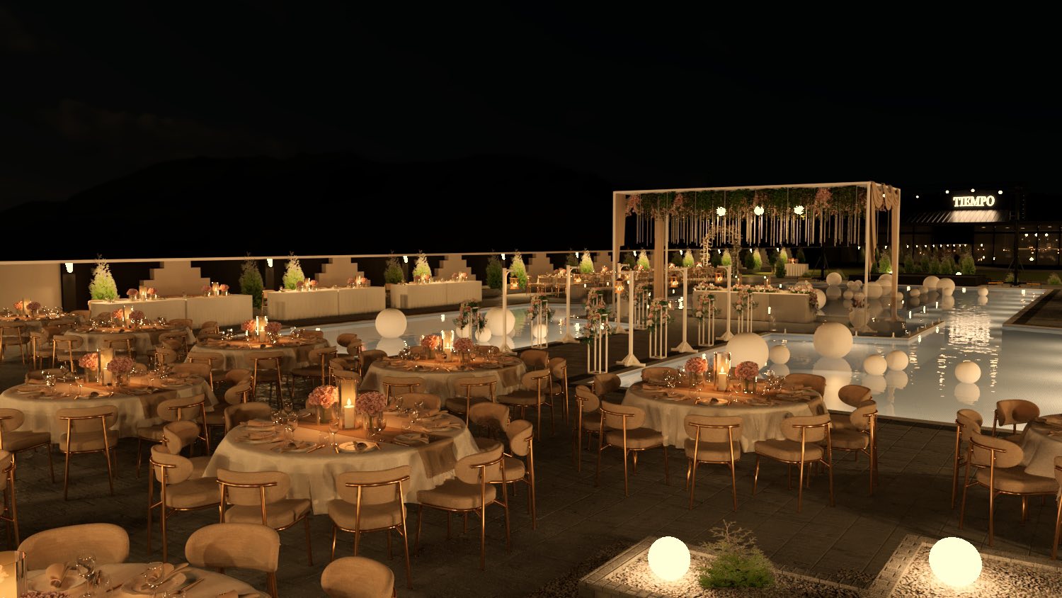 Посебен шарм му дава прекрасниот базен околу кој се протега голем и уреден простор за седење, каде гостите можат да уживаат во свежиот воздух, убавиот поглед и спокојната атмосфера. Токму овој дел го прави Tiempo совршено место за летни вечери, прослави на отворено и незаборавни моменти со пријателите и семејството, покрај вода и добра музика.