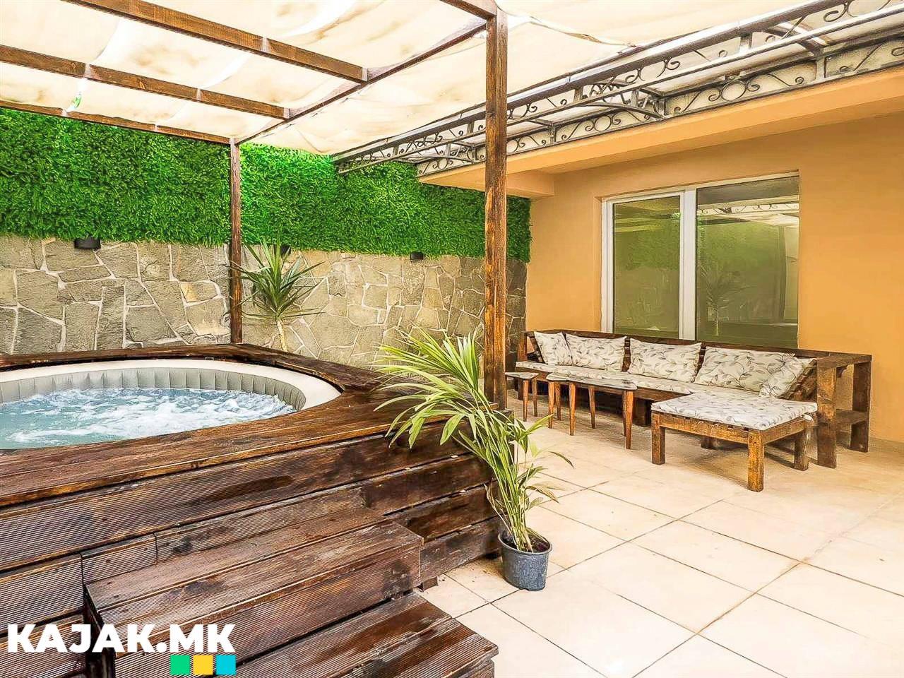 располага со брачен кревет, телевизор и плакар. Дневната соба е со аголна гарнитура