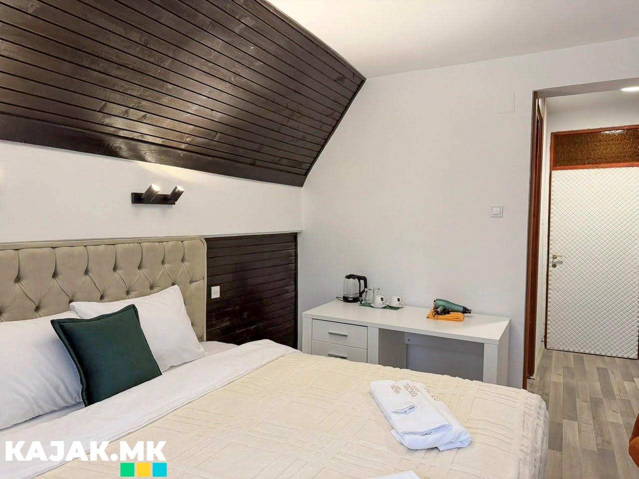 - Двокреветни соби со сопствен тоалет, тераса, кујна и дополнителен кревет на расклопување - цена 3600 денари за соба по ноќевање (за 3 лица)